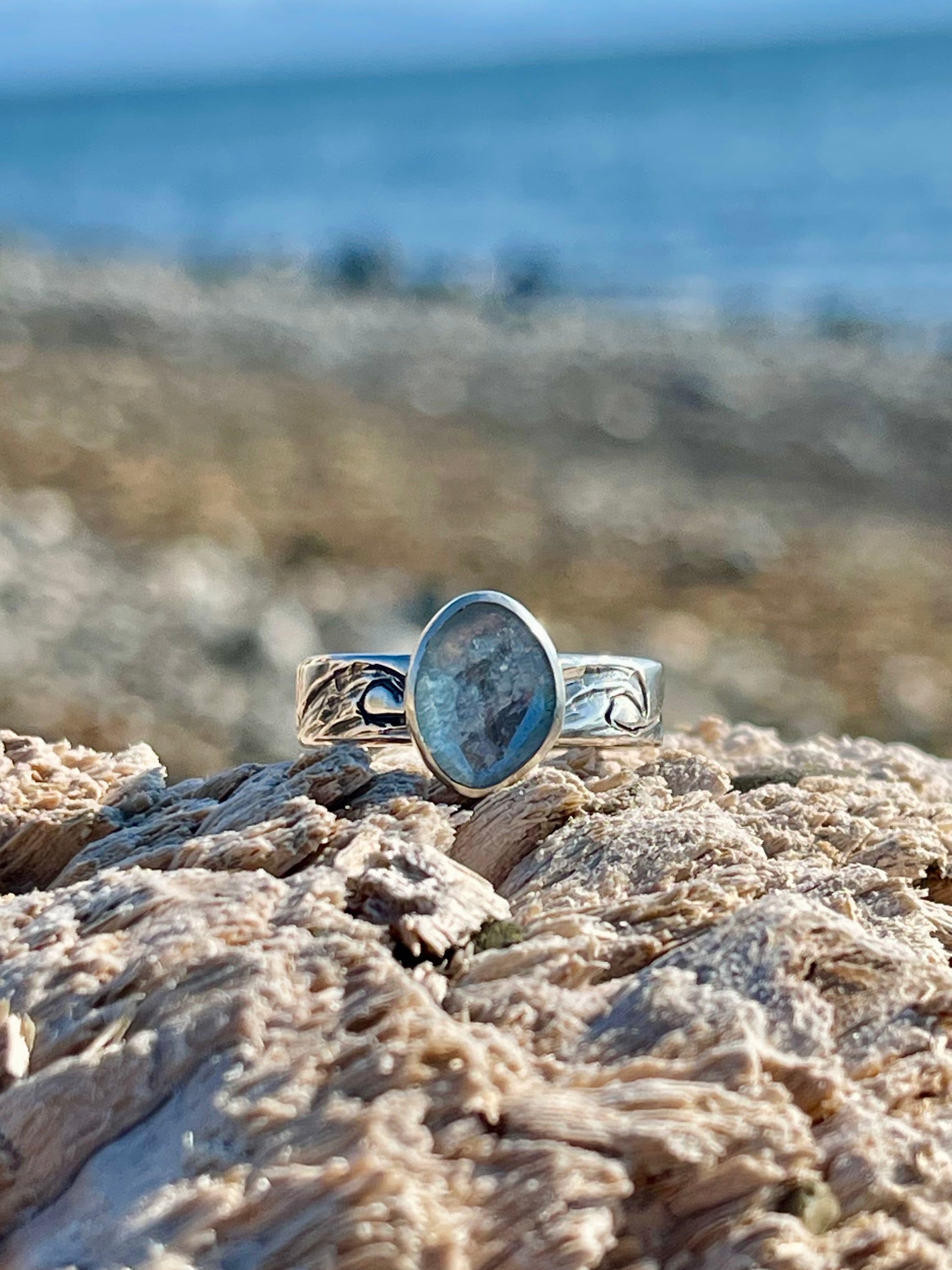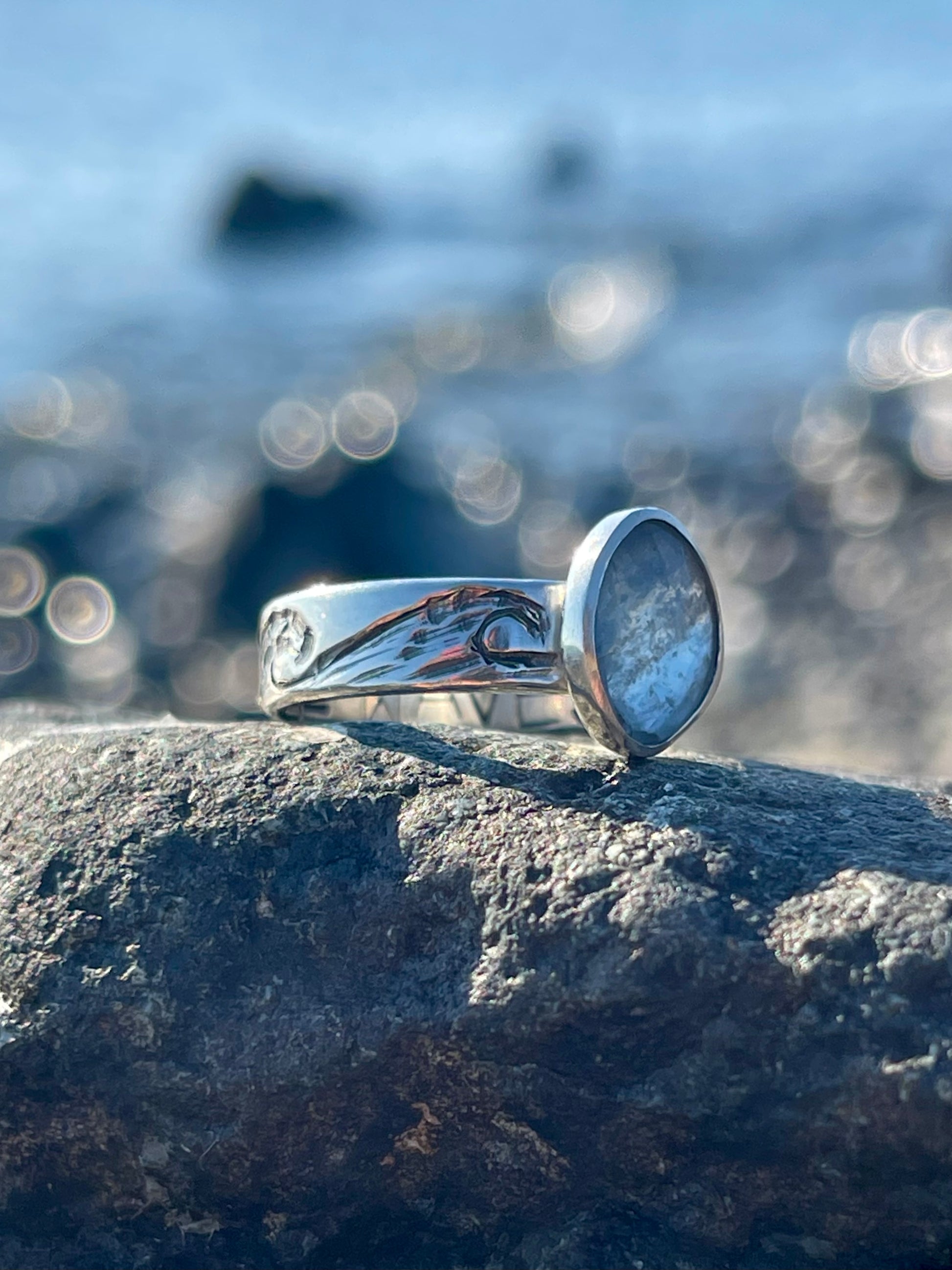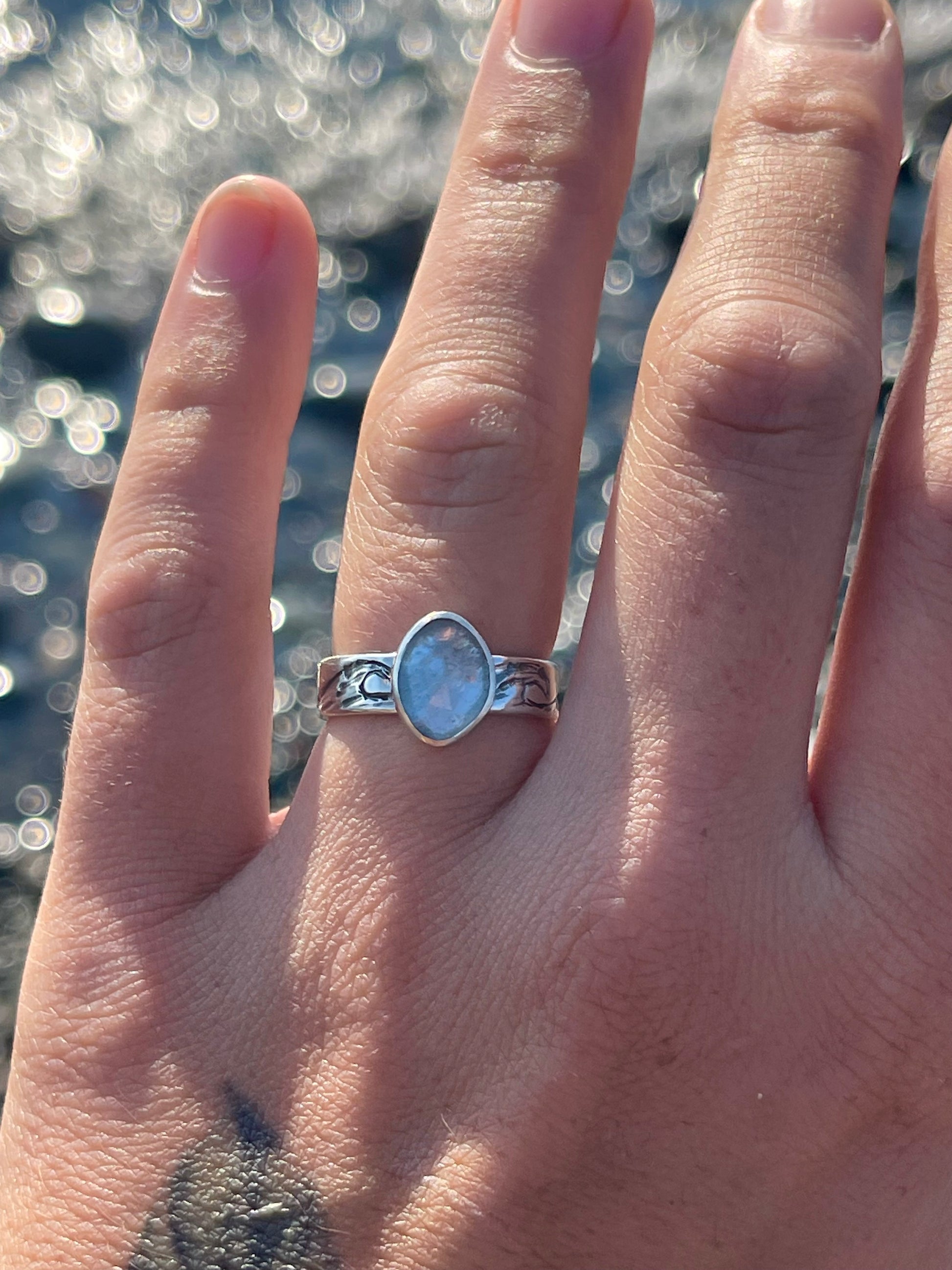 Aquamarine faceted stone set in sterling silver, with engraved waves. “MAKE WAVES” stamped on the inside of the band. Size 7.25.